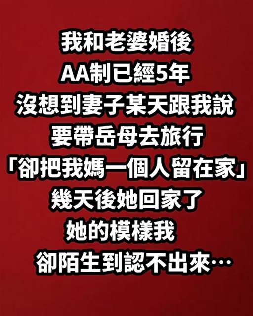 我和老婆婚後AA制已經5年,沒想到妻子某天跟我說,要帶岳母去旅行「卻把我媽一個人留在家」,幾天後她回家了,她的模樣我卻陌生到認不出來…